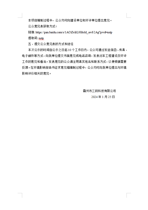 霸州市三鋼科技有限公司 關(guān)于高速護欄板生產(chǎn)線技術(shù)改造項目 環(huán)境影響評價公眾參與第一次信息公示