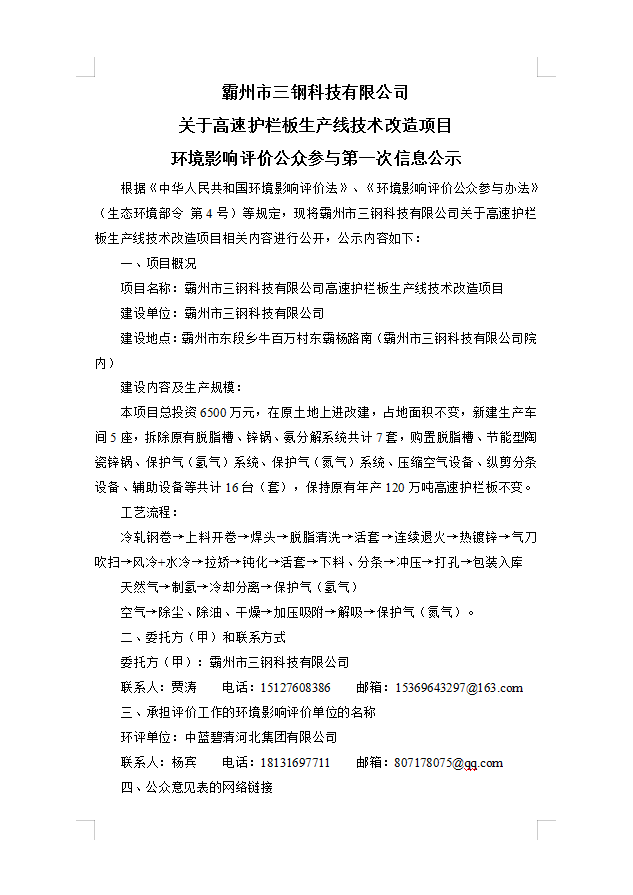 霸州市三鋼科技有限公司 關(guān)于高速護欄板生產(chǎn)線技術(shù)改造項目 環(huán)境影響評價公眾參與第一次信息公示